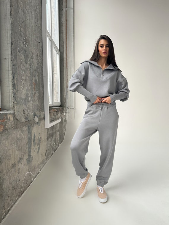 Gray Merino Wool Knitted Suit For Women 2 Piece Set Wide Collar Sweater Jogger Pants With Pockets Warm Knitted Pantsuit Winter Matching Set Etsy Ireland